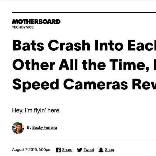 This week, I got a laugh out of Goose flying upside down is simply showing off, say experts (also known as whiffling, for you bird enthusiasts)—which reminded me of Bats Crash Into Each Other All the Time, High-Speed Cameras Reveal. Growing up I remember learning that bats had advanced sonar-based sense-and-avoid capabilities for flying in the dark; it turns out they don’t, and it’s easier to evolve impact-resistance than sense-and-avoid capabilities 🤷🏻♂️